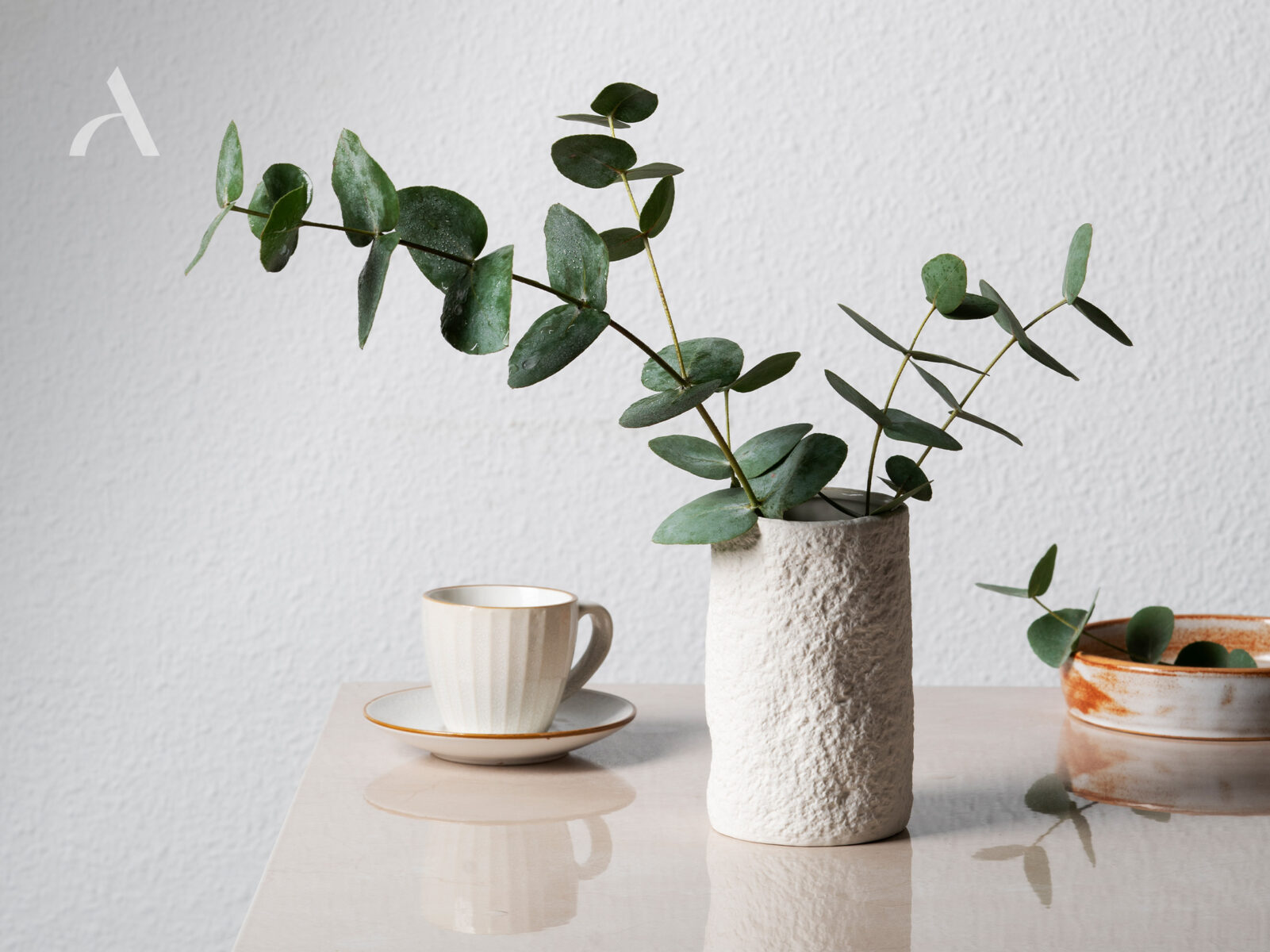 Enfoque en la sostenibilidad y elementos naturales como plantas y luz natural